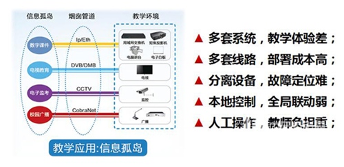 校園中的設備越來越多,電教設備管理、校園環境管理、數字廣播管理、校園安防系統等部門各自為政,耗費大量的人力資源的同時,缺乏交流,信息共享不足形成數據孤島。