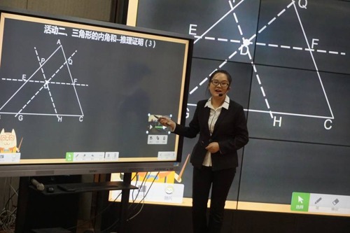 來自嘉峪關市明珠學校的丁宏玉老師給大家帶來了一堂精彩的《三角形內角和》,通過希沃白板 5 強大的學科工具的運用,三角形繪制、量角器、音視頻的引入,做到了數形結合、音形兼備,讓“三角形內角和為180度”知識點的傳遞變得直觀、生動、高效,而且巧妙地采用了希沃視頻展臺展示兩名同學的證明過程,讓孩子們在對比中更為深刻地學習,信息化技術和學科的深度融合,贏得了在場評委的一致認可,最終贏得了中學組特等獎。