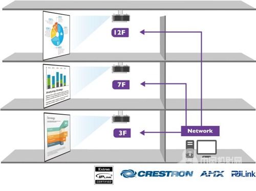 而對于像全員培訓(xùn)會(huì)、年中總結(jié)大會(huì)、新聞發(fā)布會(huì)等大型會(huì)議,由于參與人數(shù)眾多,現(xiàn)場一般需要設(shè)置3-5面左右的大屏幕,以方便會(huì)場上所有的與會(huì)者觀看演講PPT。基于此,明基高清高亮投影機(jī)SH753不僅特別增設(shè)LAN網(wǎng)絡(luò)接口,還支持多種主流品牌的控制協(xié)議,廣泛兼容包括Crestron,AMX,Extron *和PJ-Link在內(nèi)的投影機(jī)控制系統(tǒng),通過LAN網(wǎng)絡(luò)控制可實(shí)現(xiàn)簡報(bào)內(nèi)容的多個(gè)屏幕同步展示,既便于會(huì)議現(xiàn)場管理,又可減少不同投影機(jī)之間,以及投影機(jī)與PC間的連線,美化會(huì)議環(huán)境。