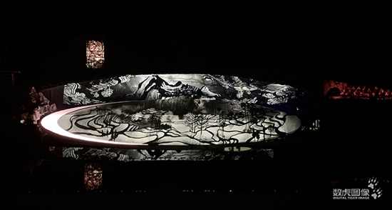水怪們再一次席卷著洪水在半空中叫囂,各大怪物如同巨石一般再次生靈涂炭整個村落,生死之際,黑衣阿媽的鮮血如瀑布飛瀉而下,落入坩堝之中濺起漫天火星……,舞美投影展示水沿著鼓模的紋理飛快地流動,隨著鼓模裂開的巨響,一個紅透心的銅鼓旋轉(zhuǎn)而起,染紅整個天地。