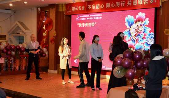 秦文君董事長上臺祝酒,引來全場陣陣掌聲!秦總說:“大家新年好”, 全體人員說:“好、很好、非常好,不忘初心!同心同行!共創雄云夢”;聲音震耳欲聾、久久回響!