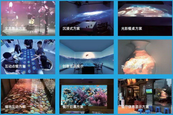 光影物顯在生活場景的信息顯示應用是近幾年開始興起的。連鎖餐飲通過前臺的投影進行信息展示,方便客戶即時了解店內信息;娛樂從來都沒有極限,視覺從來都是娛樂的殺手锏,通過光影物顯的各種成像技術,打造全息的、沉浸的光影餐廳,給人帶來耳目一新的感覺。