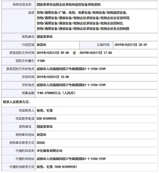 采購項目名稱: 國家某單位遠程會議系統和監控設備系統采購