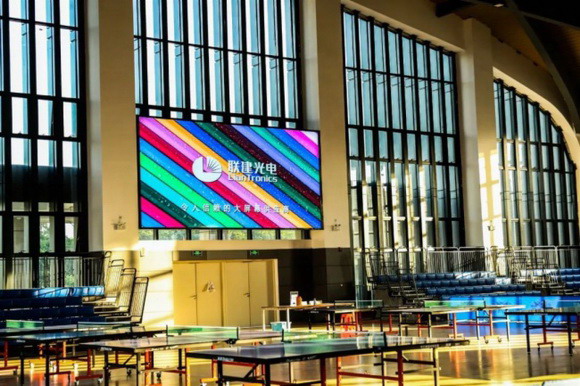 在操場一側室內籃球場內,由聯建光電為此空間獨家打造的兩幅高清電子信息屏立于左右兩側,用作比賽實時播放比分及慢動作回放等信息,在夕陽的映射下,盡顯當代校園獨特的文化特色。