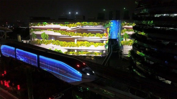 采用54臺ALPD激光投影機,打造未來云巴車廂內部投影,以及未來云軌車身及背景投影,投影總面積達2000㎡。云軌、云巴猶如科幻大片般穿梭眼前,一眼驚艷。