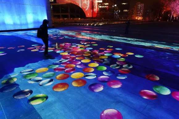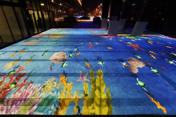 各種奇幻的影像在腳下綻放,魚兒隨著觀眾的腳步四處游竄,在虛擬的水面上泛起陣陣漣漪,讓人忍不住想參與到畫面中來。