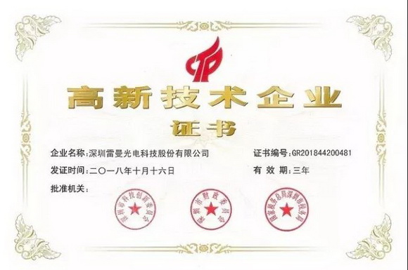 這是繼2009年、2012年、2015年獲評高新技術企業后,公司連續第4次獲得高新技術企業認定。此認定是對雷曼光電一直踐行技術驅動的發展戰略的肯定與認可,標志著雷曼光電在技術研發、經營模式、客戶服務等方面均符合國家高新技術企業認定的指標要求,也代表雷曼光電的綜合實力再上新的臺階,且將在稅收優惠、項目申報、研發立項等方面形成發展優勢。