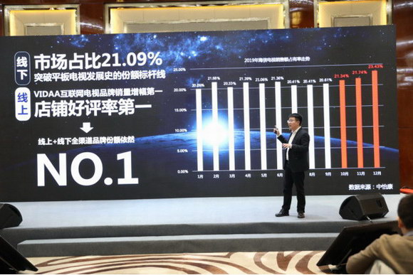 雖然近十幾年來,海信電視一直居市場榜首,但2019年,這個第一又被賦予了新的意義。根據(jù)中怡康數(shù)據(jù),2019年的12個月,海信電視線下銷售額占有率全部超過了20%,全年達到21.09%。這是中國平板電視興起20年來,第一次有品牌超越20%。此外,海信2019年發(fā)布的全新互聯(lián)網(wǎng)電視品牌VIDAA,當年就拿到了互聯(lián)網(wǎng)電視品牌銷量增幅第一和店鋪好評率第一。