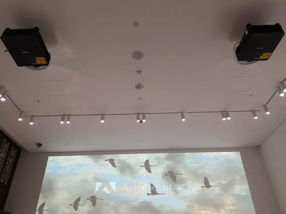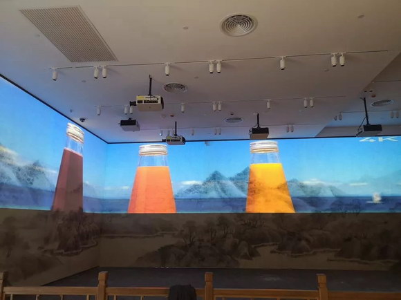 5臺7000流明佳能高清3LCOS三片反射式激光投影機WUX7000Z,投射在長度19米富有創意的L型融合投影墻面上,得益于佳能獨有的LCOS反射式芯片技術,搭配佳能獨有的高質量低光損,高位移的超廣角直投光學鏡頭,畫面色彩細膩,像素灰階更加平滑自然。