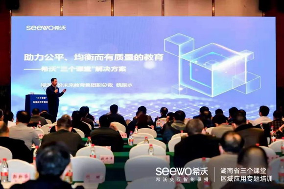 促進信息技術與教育教學實踐深度融合,視源股份未來教育集團副總裁魏振水代表希沃在本次培訓上做了以《“三個課堂”助力公平、均衡而有質量的教育》為主題的發言。