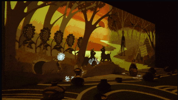 《圖騰密碼》展項采用6臺Vivitek(麗訊)RU70983工程投影機,獨創寫意的遠古動畫影像從墻面覆蓋至地面,生動還原5000年前的上古生活場景。而在場景之中,放置著形態各異的大小彩陶瓶,最為矚目的當屬人頭型器口彩陶瓶,以人頭像及抽象的線條結合,詩意的詮釋中華文明最為古老的彩陶文化。