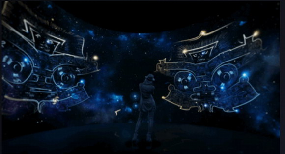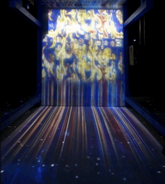 “五星出東方利中國”錦護膊,藏于新疆維吾爾自治區博物館,為東漢織錦,制作工藝復雜,是古代勞動人民最高智慧的結晶!犊椞鞕C》展項通過8臺Vivitek(麗訊) RU70983工程投影機,還原恢弘的巨型織機裝置,伴隨著夢幻的星河流動,織就出五星出東方的祥瑞圖案,以絕妙的傳統織錦工藝,襯托中華歷史悠久的圖騰文化。