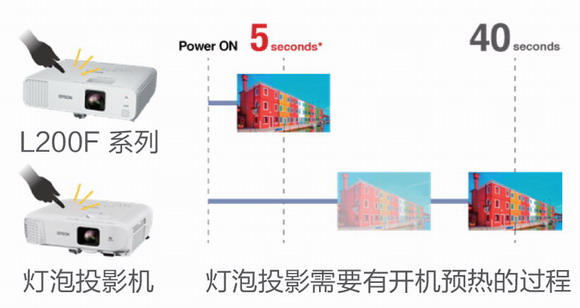 說到效率首先要給大家算筆賬, CB-L200系列投影機因無需預熱,在快速啟動模式下,可達到5秒即時開機*3,相較于燈泡投影機的開機時間,每次開機都將能節省35秒。以每天開機一次為例,一年就能節省3.5小時,每7年就能多獲得一整天時間!