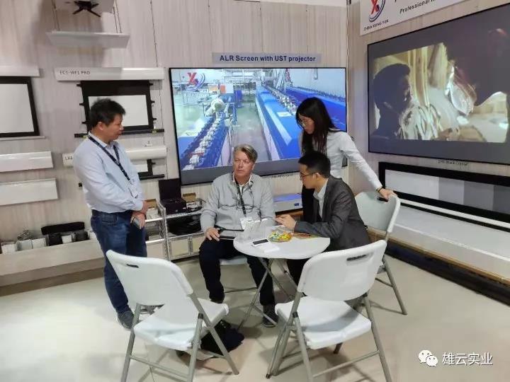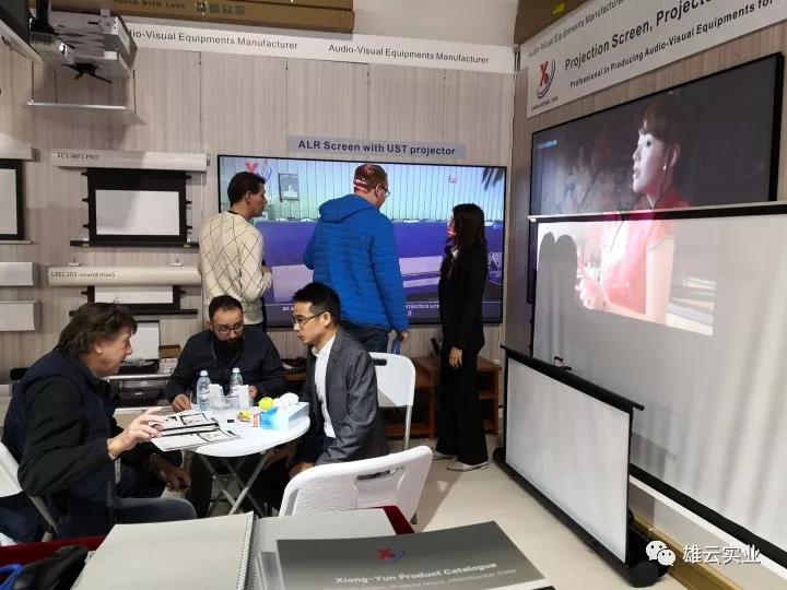 我們的展位呈現了客廳影院系統,家庭影院系統,會議視訊系統等多套系統。眾多高端產品:窄邊黑晶抗光幕、黑柵抗光硬屏、電動幕、豪華電動地升幕、隱藏天花幕等銀幕,還有高端系列吊架和高品質音視頻線材參展,吸引很多國外參展客商的眼球。