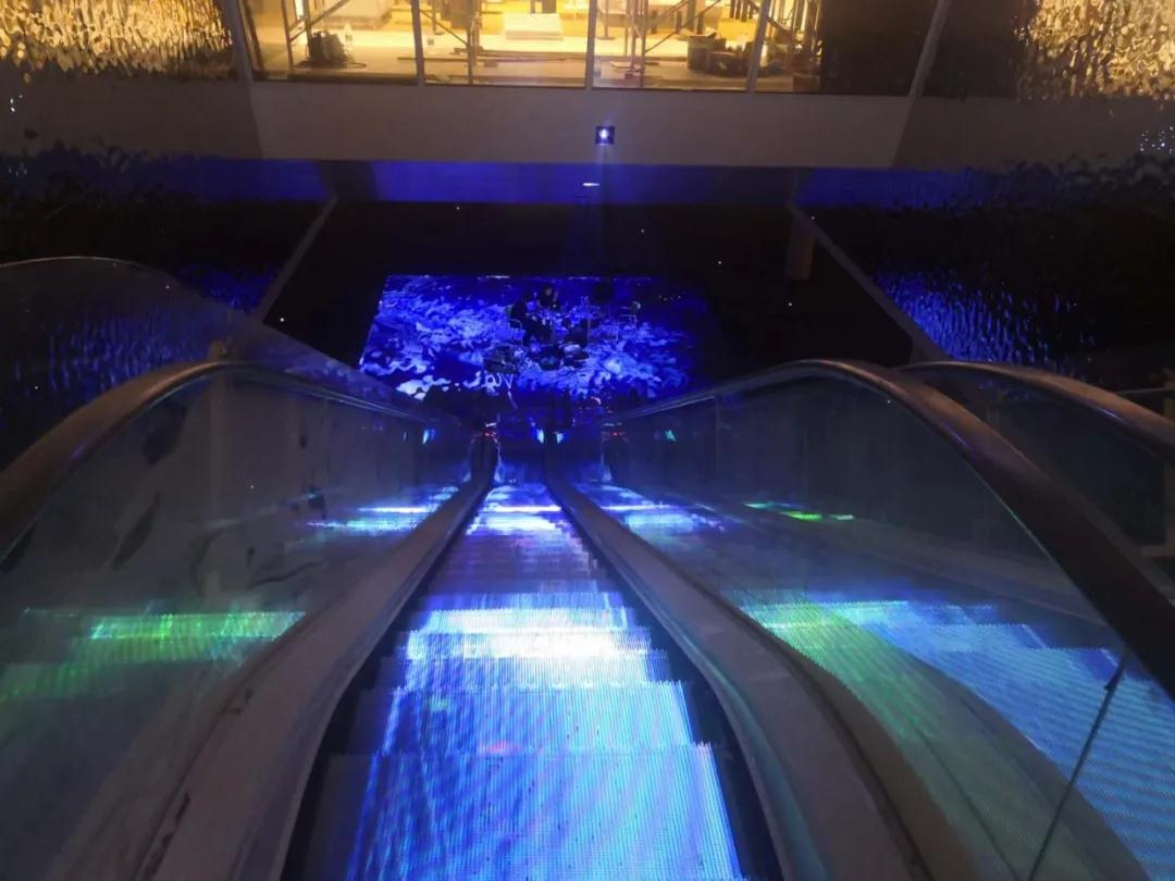 在此項(xiàng)目中,扶梯部分采用5臺(tái)松下PT-SMW53C工程投影機(jī),地面部分則采用了13臺(tái)松下PT-SMW53C工程投影機(jī),圍繞扶梯進(jìn)行投射。