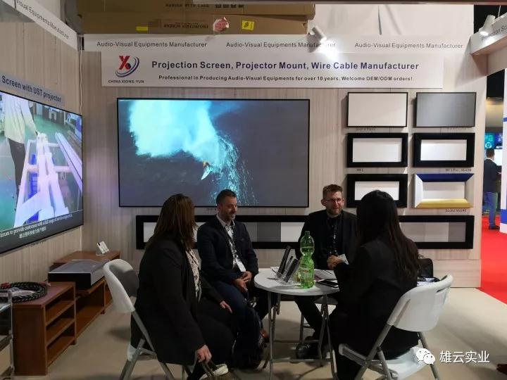 雄云實業精心布置的展位,高端大氣讓國外客戶記住了我們獨具一格的風格。我們的展位呈現了客廳影院系統,家庭影院系統,會議視訊系統等多套系統。產品有:窄邊黑晶抗光幕、黑柵抗光硬屏、電動幕、豪華電動地升幕、隱藏天花幕等銀幕,還有高端系列吊架和高品質音視頻線材參展。