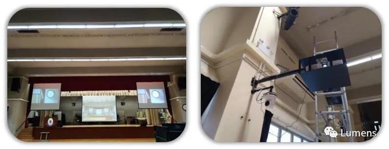 三臺Lumens超高清會議攝像機VC-BR70H安裝在學校大廳,以捕捉學校進行的現場表演。攝像機連接到切換器,圖像通過投影儀顯示。