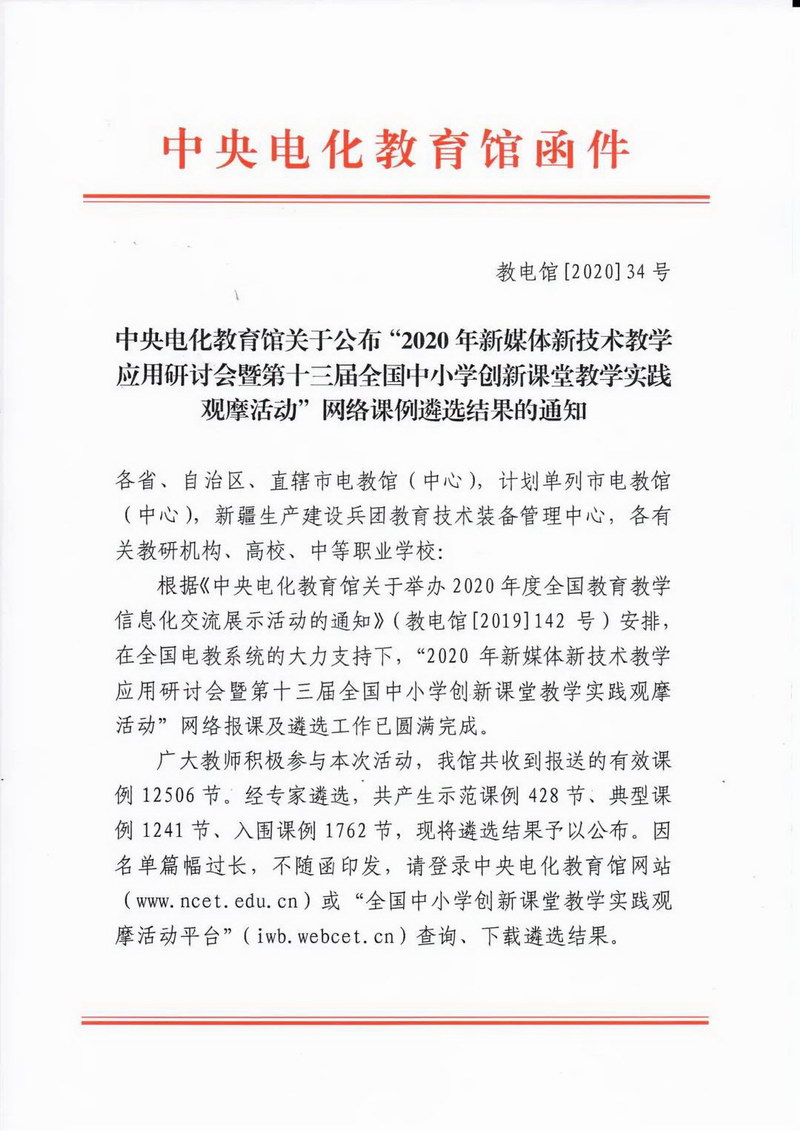 “2020年新媒體新技術(shù)教學(xué)應(yīng)用研討會(huì)暨第十三屆全國(guó)中小學(xué)創(chuàng)新課堂教學(xué)實(shí)踐觀摩活動(dòng)”公布評(píng)選結(jié)果