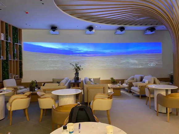 項目簡介:隨著多媒體技術的發展,商家們更傾向于用大屏幕吸引顧客的注意力。近期,大視MPG30X融合處理器成功應用于滁州某售樓中心大廳的投影系統。本次項目采用將四路高清信號輸入大視融合處理器,最終融合成6480x1080的投影畫面。
