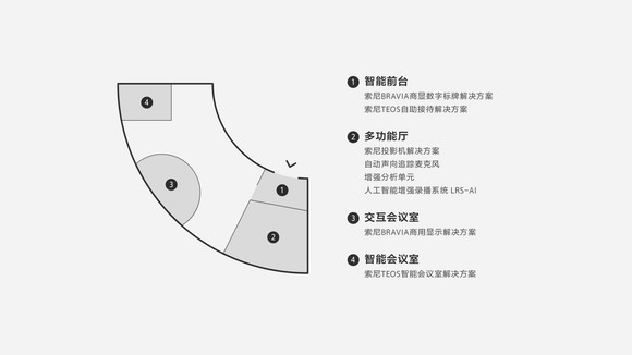 “多功能廳”是索尼商業解決方案體驗中心中最重要的展廳,匯集索尼黑科技“增強分析單元”,音頻產品“自動聲向追蹤麥克風”,索尼激光投影機寬幅融拼等產品,為大型會議、報告、培訓等提供專業音視頻解決方案,打造擁有多應用場景的功能廳。