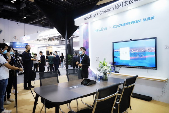 newline+Crestron遠程會議解決方案,將辦公區打造成為一個集智慧、工作、會議與協作為一體的空間,在這里,觀眾了解先進的中控系統、一鍵入會、無線投屏等實用功能。