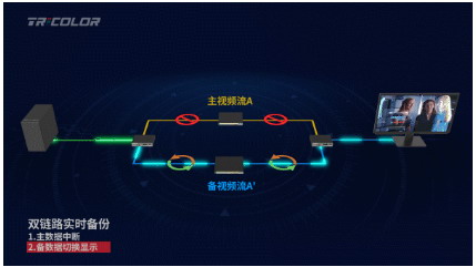 介于單鏈路切換備份的部分劣勢,雙鏈路實時備份技術應運而生,實時備份技術下,主備兩條鏈路同時在傳輸相同的碼流,當主鏈路故障后,輸出節點直接選擇備用鏈路的碼流進行顯示輸出,具體過程如下: