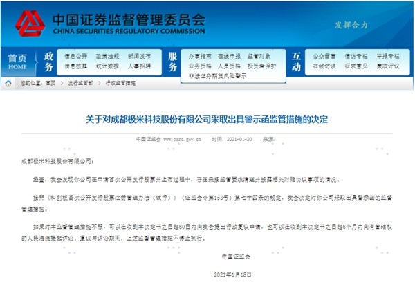 1月20日晚間,證監會官網發布的一則警示函,再次將擬科創板上市企業成都極米科技股份有限公司(以下簡稱“極米科技”)推上了輿論的風口浪尖。由于極米科技在IPO上市過程中,存在未按監管要求清理并披露相關對賭協議事項的情況,證監會決定對極米科技采取出具警示函的監督管理措施。同時收到警示函的還有其IPO主承銷商中金公司及兩名保代。