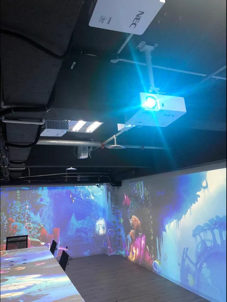 能讓參觀者“忘我”地進行游覽,感受震撼無比的視聽體驗,是沉浸式CAVE投影受到當下越來越多客戶青睞的重要因素。6臺CS3300HL以拼接融合的方式,通過360度環繞投影,在三面墻體以及會議桌面上投出超大炫酷畫面,極具視覺沖擊力。