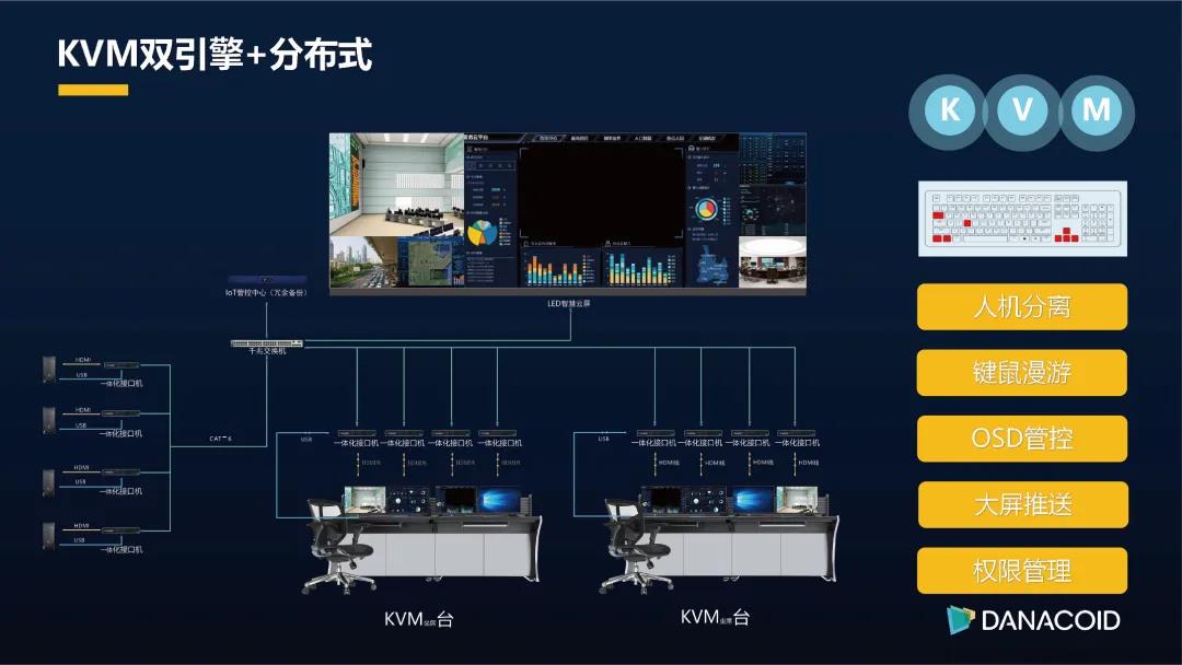 雙引擎引領分布式新趨勢,通過一根網線傳輸兩種不同協議的信號,支持單臺設備兼容兩個平臺控制;KVM超低延時,視頻無壓縮,4:4:4 全采樣;大屏顯示任意漫游疊加;IPC等平臺可無縫對接。分布式系統去中心化的設計擴展性靈活,音視頻全IP化可遠距離傳輸,資源共享,多平臺融合對接。