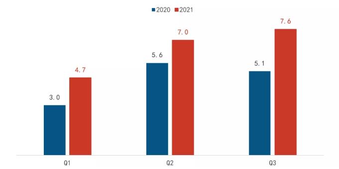 2021年第三季度,中國激光電視市場出貨量達到7.64萬臺,相比去年同期增長近50%,相比今年二季度環比增長9.5%。在上游核心元器件IC芯片、光閥芯片等缺貨的情況下,市場依然保持了當季和累計前三季的大幅度增長。