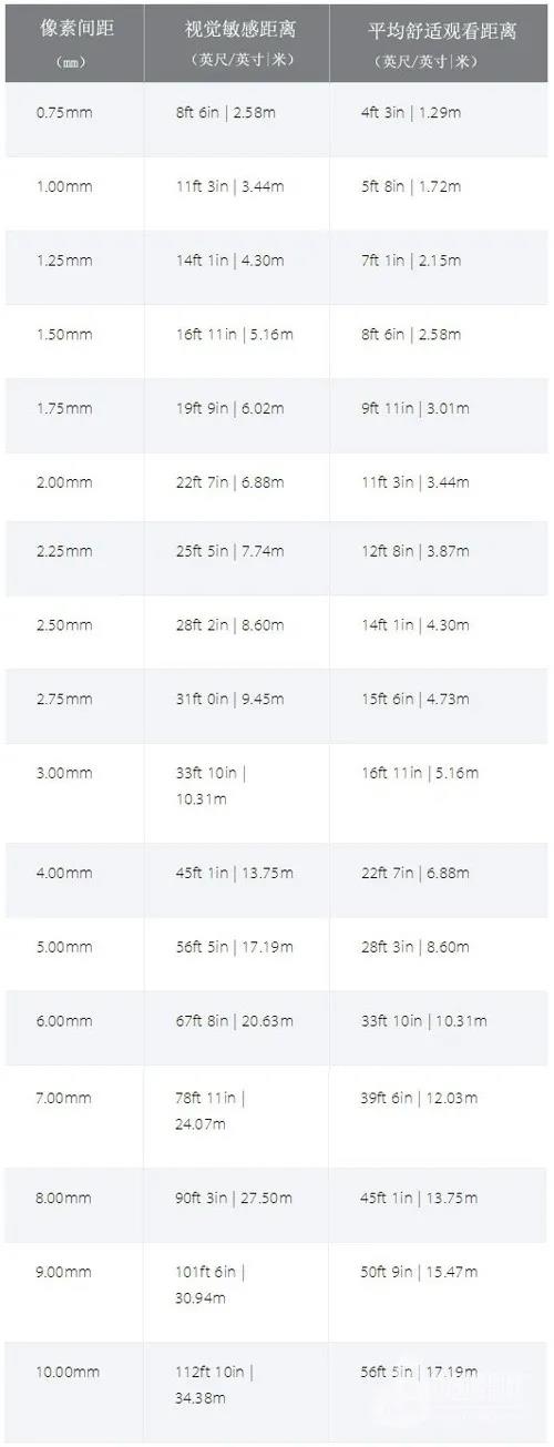 計算公式為:像素間距×10=近似觀看距離(以英尺為單位)