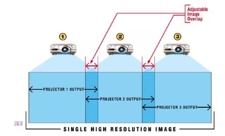 簡單重疊,即兩臺投影儀的畫面有部分重疊,但沒作淡進淡出處理,因此重疊部分的亮度為整幅其余部分的2倍,在顯示效果上表現為重疊部分為一亮條。