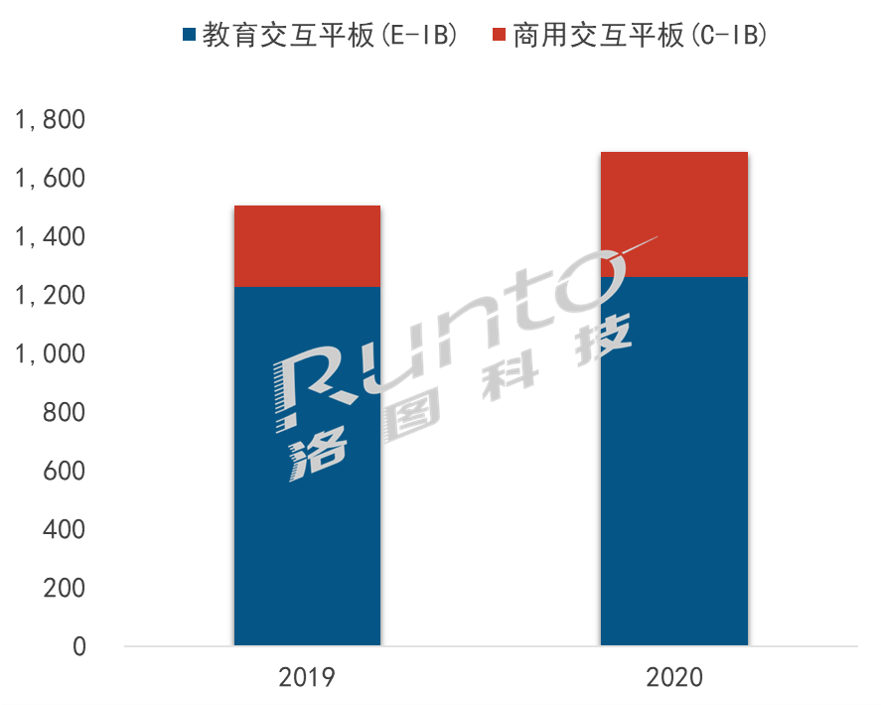 根據洛圖科技(RUNTO)最新《中國大陸交互平板市場分析季度報告(China Interactive Board Market Analysis Quarterly Report)》顯示,2020年中國大陸交互平板市場出貨量達169.4萬臺,同比上升12.7%。其中,教育交互平板(E-IB,Educational Interactive Board)占比達74.5%,出貨126.1萬臺,同比微增2.8%;商用交互平板(C-IB,Corporate Interactive Board)占比為25.5%,出貨43.2萬臺,同比增幅達56.5%。