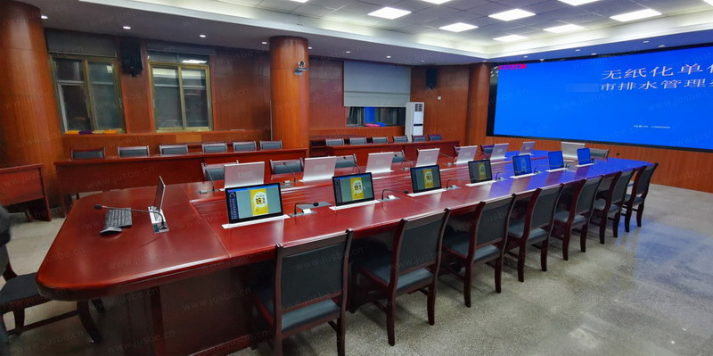 按照會議室布局,配置了16點位的無紙化升降一體終端,以嵌入式方式安裝在會議桌面,令會議室整體整潔、美觀。系統(tǒng)平臺采用的是JUSBE自主研發(fā)并擁有著作權(quán)的軟件系統(tǒng),集合了豐富強大的會議服務(wù)功能,只需觸控屏幕即可快速幫助參會者輕松掌握會議信息,高效完成會議內(nèi)容。