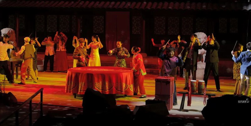 演員聚集在舞臺,現代舞,大型民樂表演,打擊樂,烘托出舞臺的熱烈、亢奮,一場喜慶、熱鬧的婚禮即將開始。