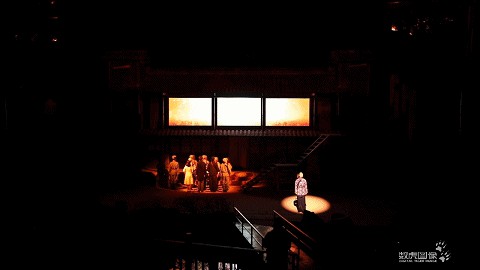 舞臺呈現三個表演空間,阿慶嫂和眾人定計如何智斗胡司令,前區一片熱鬧的婚禮場景,后區(二樓投影)舞蹈演員用肢體演繹定計的內容。可移動雙面鼓、屏風,樓梯等道具,不僅迅速有效的調度演員,還增強了舞臺張力。