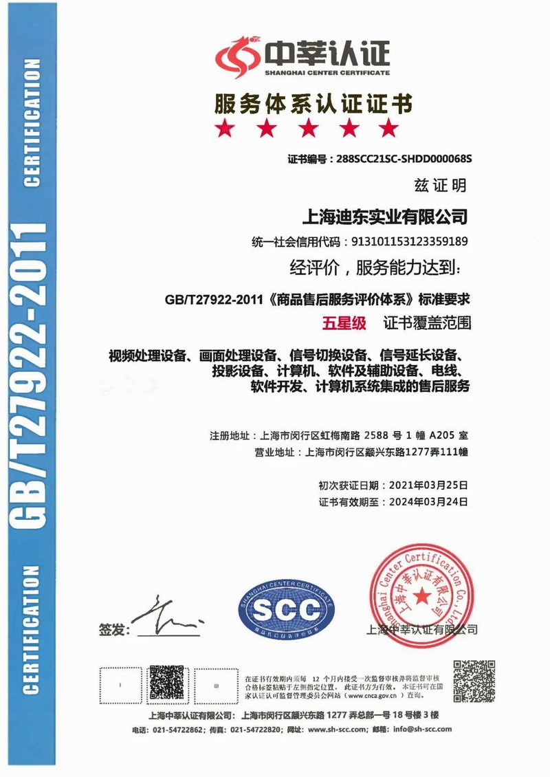 2021年,迪恒投影依托強(qiáng)勁的綜合實(shí)力及行業(yè)品牌影響力,通過了由中國國家認(rèn)證認(rèn)可監(jiān)督管理委員會(CNCA)的嚴(yán)格審查,終于獲得了國內(nèi)視頻顯示設(shè)備行業(yè)售后服務(wù)最高認(rèn)證標(biāo)準(zhǔn)證書: