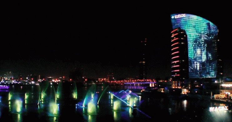 12臺投影機來營造美麗的海灣水幕,6個水幕共同組成一個寬68米、高13米的無縫巨幕,數百個LED燈光特效,360度的多媒體影像,全方位展示了“火、水、光、敬畏”為主題的現場表演。光影蜿蜒、盤旋,釋放火花,像水中的蛟龍,濺起水花,引得觀眾頻頻尖叫,不愧是節日城市,好一派熱鬧歡騰。在光的助力下,這里的水沸騰著,釋放出鮮有的能量,隨著夜幕降臨,一場水秀、一個故事正在上演。