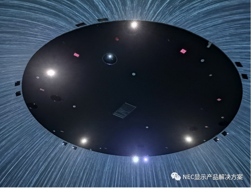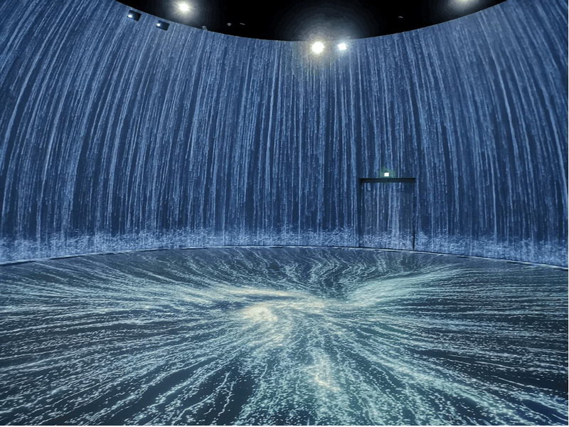 “飛流直下三千尺,疑是銀河落九天”,大詩(shī)人李白描述的壯美奇景在這里“真實(shí)”再現(xiàn)。宛如蛋殼的球幕展廳里,巨型瀑布傾瀉而下,似銀河從天而降,并在地面迅速匯聚成河,波光粼粼、浩瀚無(wú)垠,令觀者贊嘆不已。得以呈現(xiàn)如此雄偉壯觀的瀑布奇景,離不開(kāi)20臺(tái)NEC 4K激光投影機(jī)PX1005QL-B+的精彩演繹。巨型碗幕直徑15.4米,高度5.9米,20臺(tái)NEC PX1005QL-B+通過(guò)隱藏式安裝,采用融合拼接的方式,分別在近百平方米的弧形墻面和圓形地面上進(jìn)行投射,打造沉浸式互動(dòng)投影,將觀眾帶到“廣闊無(wú)邊”的水世界中,感受瀑布飛流直下的壯麗美景。
