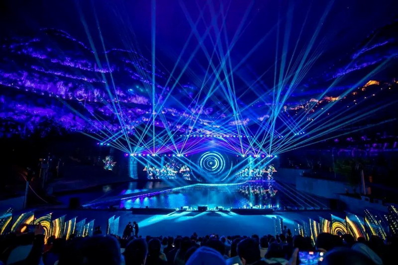 為了創造更生動的沉浸體驗,在本次光影秀中首次使用了觀眾席可升降晶膜屏設備,并融入燈光動態編程、崖壁激光成像、包裹式全景音響等前沿技術。通過編程集控同步調動,讓觀眾宛若置身其間,在導演精心營造的一幕幕繽紛幻境中酣暢神游。