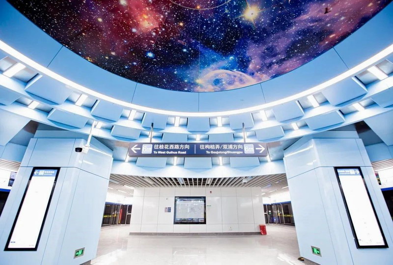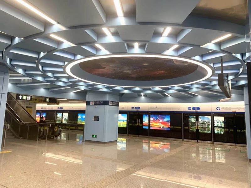 銀湖站吊頂裝飾以“銀湖之光”為設計主題,中心區域以宇宙空間為主導地位,運用現代設計的手法,弧形面板燈組成圓環,中間加入條形面板燈與鋁板結合形成藝術星空效果,以中心為原點進行微妙的旋轉,用燈光代替日月星辰,訴說來自宇宙的神秘和浪漫,讓乘客置身于浩瀚無垠的太空宇宙中。