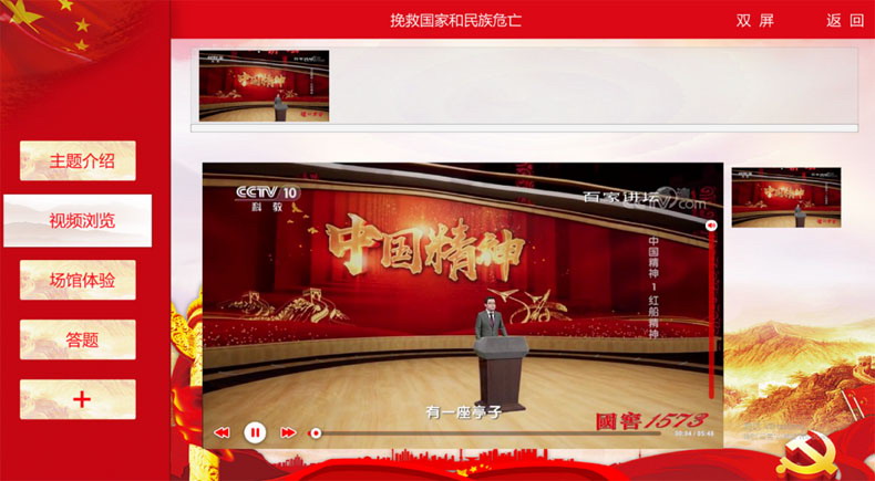 虛擬展館總面積達(dá)10000平米(模擬),運(yùn)用3D和VR全景技術(shù),采取多媒體互動(dòng)疊加圖文、音視頻熱點(diǎn)植入等形式,并配置答題測(cè)評(píng)系統(tǒng),生動(dòng)再現(xiàn)“百年征程”背后的故事,多維度強(qiáng)化學(xué)習(xí)記憶。
