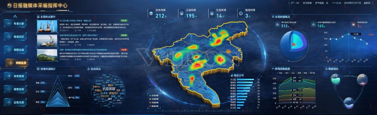 基于地圖呈現全省各地市最新輿情的級別和數量,同時顯示當日系統分析抽取的敏感輿情信息標題和摘要,通過當前關鍵詞的熱搜,以熱云圖方式呈現網民對熱詞的熱搜程度;動態顯示當前輿情來源占比、地域分布、輿情指數、情感指數,實現對輿情信息系統中的突發熱點信息全景可視化呈現,為新聞策劃提供參考依據。