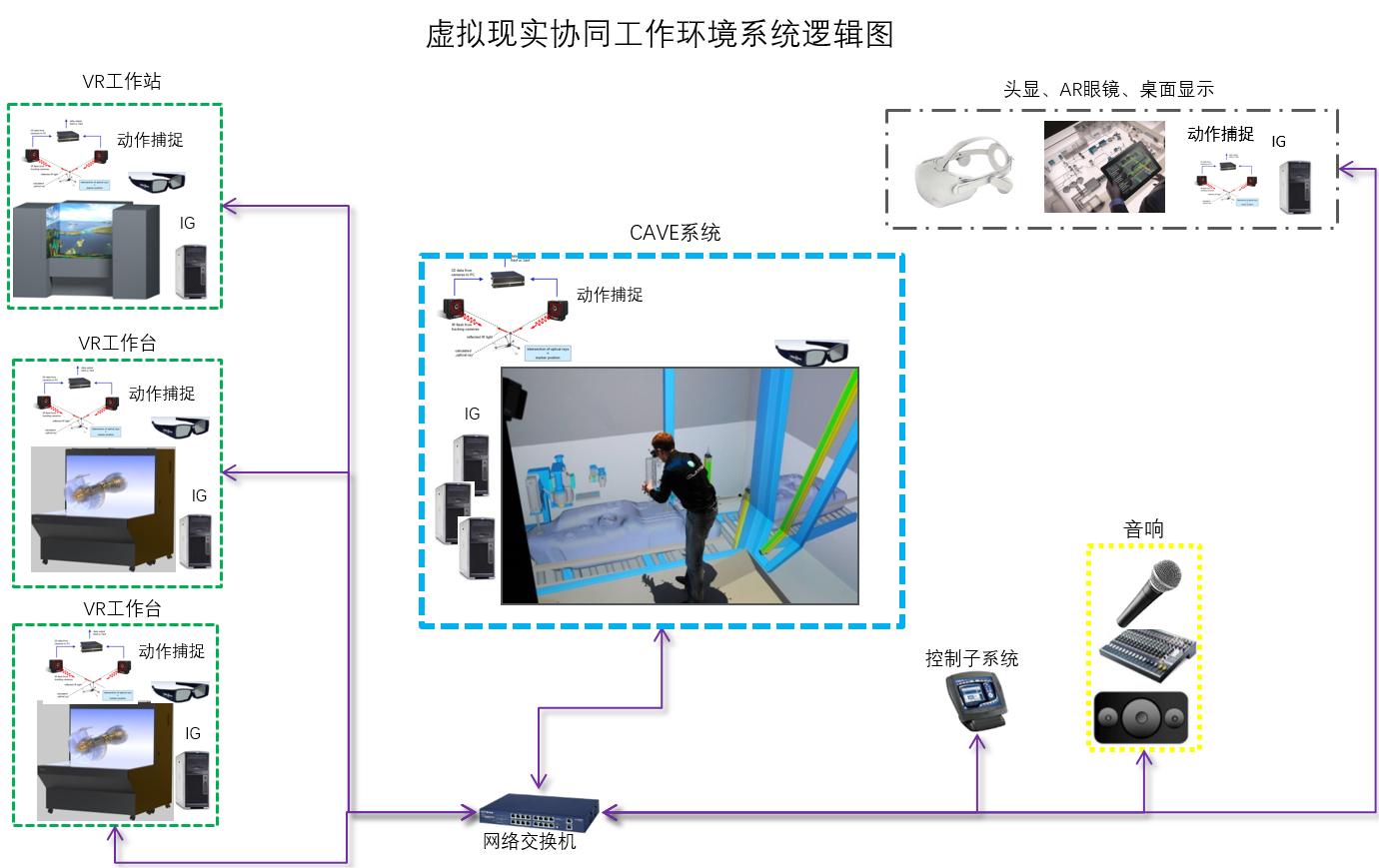該系統主要包括:一套四面CAVE顯示系統、兩套VR工作臺(標準化緊湊型兩面CAVE系統)、一套VR工作站(標準化緊湊型四面CAVE系統),應用軟件和外設等。