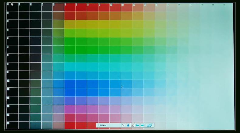 在256位色階測試中,為了將投影機在色彩方面的表現打到最佳,我們對投影機參數進行了適當調整以呈現最佳的色彩效果。通過測試畫面我們可以到除了最右側白色一列外,其他色位基本都能清晰分辨,表現還是很不錯的。