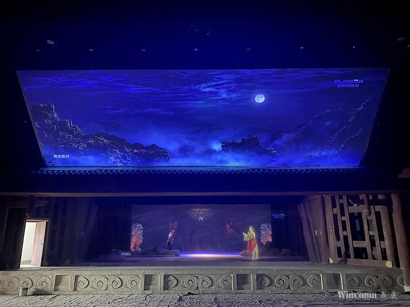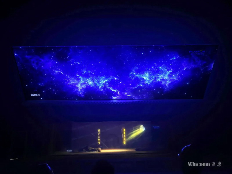 劇場投影場景共分為三個部分,分別是主舞臺上方的天幕,舞臺中間的幻影成像,以及舞臺后方的場景切換投影區(qū)域。