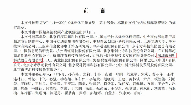 作為超高清視頻產業一份子,洲明受邀與北京百度網訊科技有限公司、中國電子技術標準化研究院、中央宣傳部電影衛星頻道節目制作中心、中國移動通信集團有限公司、中視奇云(北京)科技有限公司、上海交通大學、華為技術有限公司、京東方科技集團股份有限公司等23家CUVA成員單位一起參與該項標準的編制。