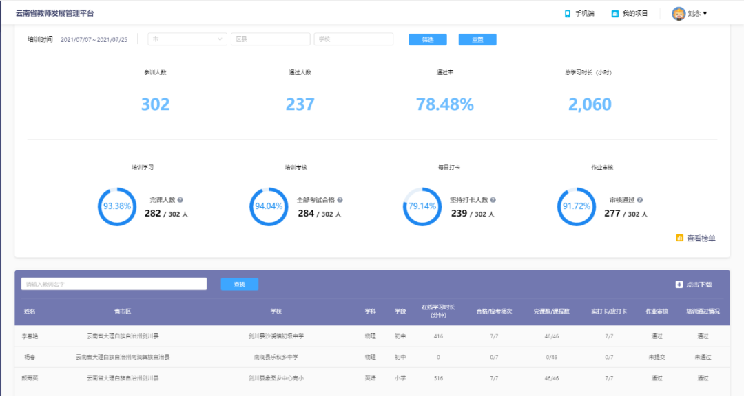 7月7日-7月25日為培訓第二階段,主要內容為大理州骨干教師信息化技能提升培訓。此階段培訓以線上培訓的形式展開,全州累計302名骨干教師參加培訓,共有46節課程,分為19天學習任務。
