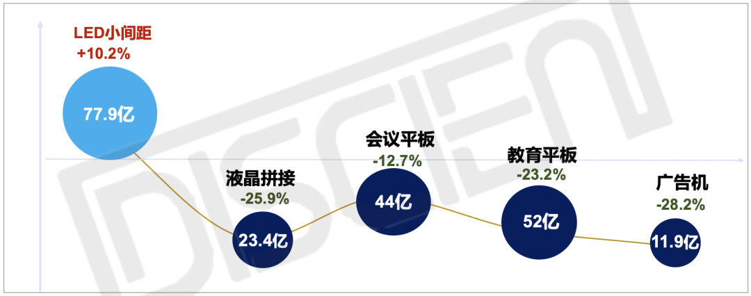 今年以來(lái),國(guó)內(nèi)疫情多發(fā)散發(fā)、各地方政府預(yù)算持續(xù)收緊,經(jīng)濟(jì)運(yùn)行存在較大壓力,上半年國(guó)內(nèi)GDP增速僅有2.5%;在此背景下,中國(guó)商用顯示市場(chǎng)也面臨極大的增長(zhǎng)壓力,根據(jù)DISCIEN(迪顯)統(tǒng)計(jì),上半年多個(gè)商用顯示產(chǎn)品銷(xiāo)售額呈負(fù)增長(zhǎng),如教育平板、液晶拼接、廣告機(jī)都出現(xiàn)20%以上的負(fù)增長(zhǎng),而反觀LED小間距仍處于產(chǎn)品增長(zhǎng)期,上半年銷(xiāo)額近78億元,同比增長(zhǎng)10.2%,位居商顯市場(chǎng)首位。
