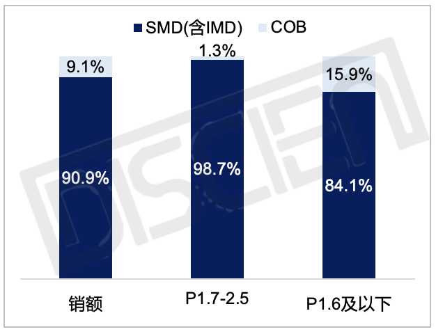 但分間距段來(lái)看,COB間距微縮化進(jìn)程更快,其主要以P1.6及以下出貨為主,在其內(nèi)部占比已近16%,明顯高于整體市場(chǎng)占比,未來(lái)隨著間距不斷收窄, COB產(chǎn)品優(yōu)勢(shì)也將持續(xù)凸顯。